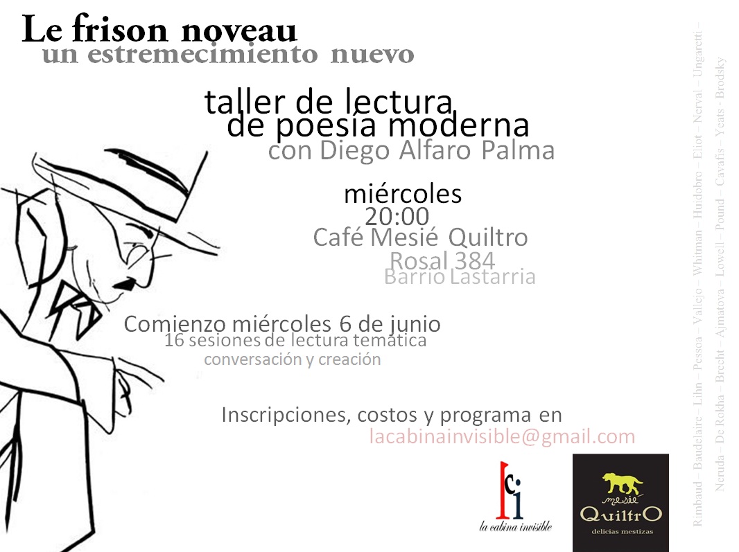 Estas y otras preguntas se plantea el Taller de lectura de poesía moderna. En estas 16 sesiones el asistente se convertirá en un detective, ahondando en algunos de los poemas más significativos de la tradición y la vanguardia de estos últimos siglos, con una metodología basada en la lectura concienzuda, el diálogo y la creación. Entre los temas a debatir, y que irán abriendo paso los versos, se cuentan el estudio del sentido de la poesía, la desacralización del mundo actual, la relación entre ésta y la política, la definición de Modernidad y sujeto, más el tratamiento de los eternos motivos que movilizan la escritura: el amor, la muerte, el viaje, la felicidad, la nostalgia, etc.