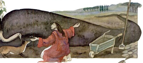 La Planta-Ballena sopló y sopló. Pronto estaba un poco más pequeña. En cuanto se encogió, su piel, que antes había sido tensa y brillante, se cubrió con pequeñas arrugas. Por último Dios le dijo: