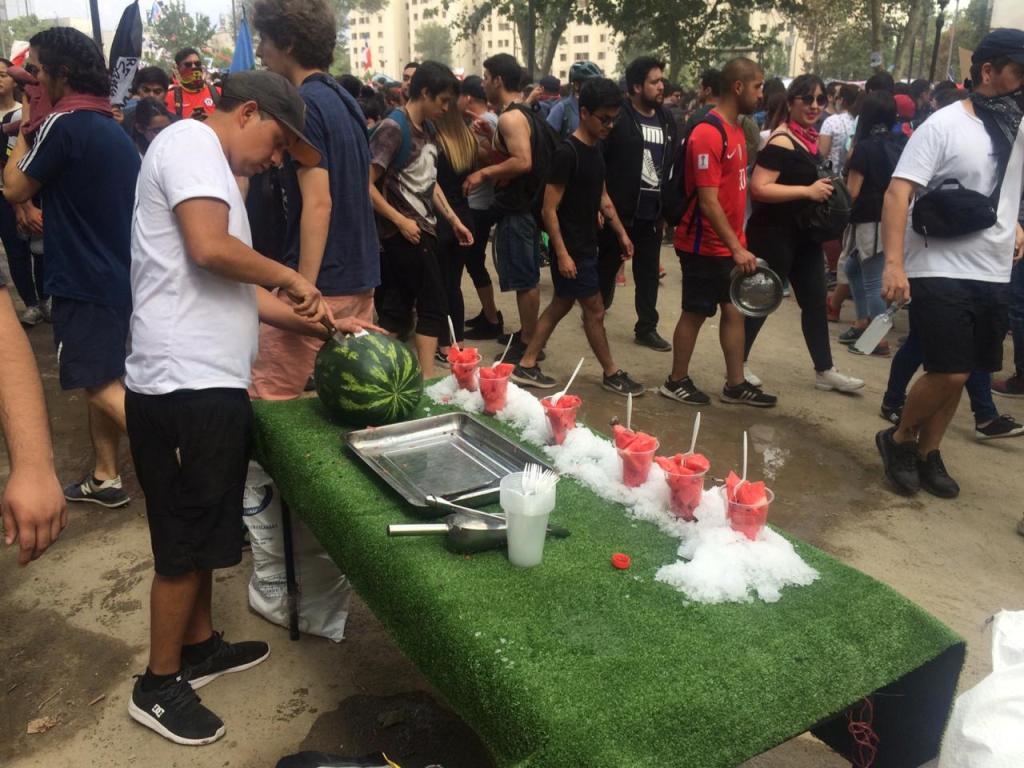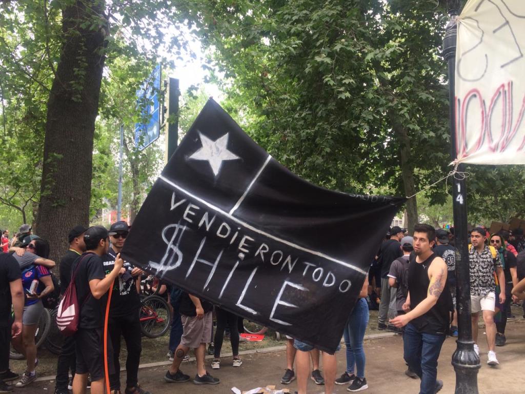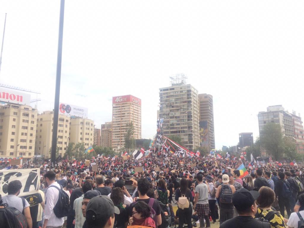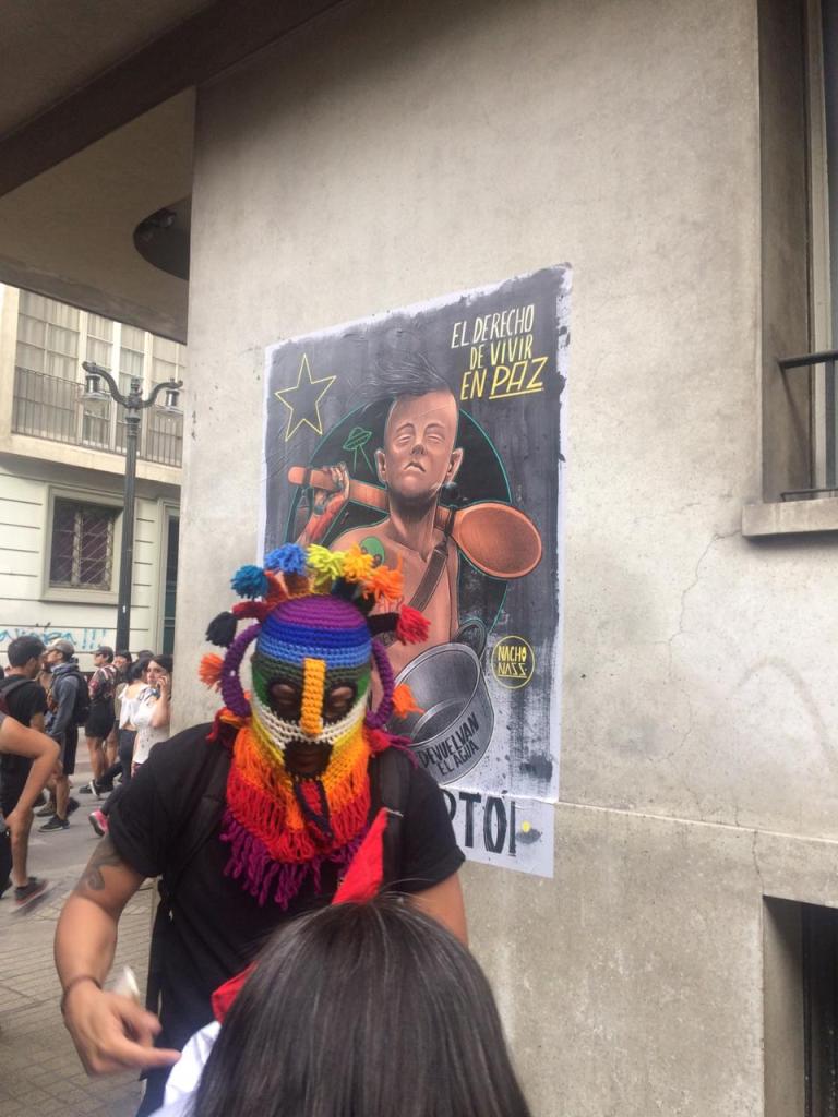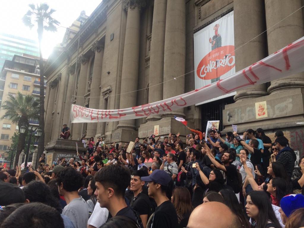 Yo me uní como un alienígena más a la salida del trabajo, como muchos luego de sacarse la camisa o la blusa y ponerse unas zapatillas más cómodas. Desde Manuel Montt se podían ver esas masas de oficinistas, jóvenes, ancianos llegar desde todas partes de la ciudad, bajándose desde las antiguas naves espaciales del transporte público o desde las habilatadas estaciones de metro. En el camino había poemas visuales pegados, banderas negras de Chile, una gran pizarra donde cada uno escribía su deseo de mundo y una extraña sesión de electrónica a la que uno que marchaba gritó: “¡esto no es nada una fiesta, cuicos culiados!” y ahí varios explotaron en aplausos al tiempo que las barras del Colo-Colo, de la Universidad de Chile y de la Universidad Católica se mezclaban gritando a un solo pulmón. Nunca se vieron tantos lienzos mapuches, tantos en algarabía y en unidad, las estatuas de bronce tomadas hasta la última oreja de los caballos, ventas de sandía, choripanes, agua, limones, chocolates, tabaco y al rubro de la salud con sus delantales no tan blancos tras semanas de marchar contra el desvalijamiento de los hospitales y la reducción de los presupuestos –en todos estos días vi a mi hermana salir orgullosa de su profesión levantando esa misma pancarta. Un poco más allá los profesores con su ropa gastada, sus lentes grandes y su energía inagotable, a unos metros los artistas callejeros interviniendo los muros, los guitarristas afuera de la Biblioteca Nacional cantando “El derecho de vivir en paz”, quizás la canción más escuchada en las radios. Todo el Parque Forestal era un continuo interplanetario de gremios, asociaciones civiles, de ciudadanos gritándole al presidente su ineptitud, a los partidos su pésima comprensión lectora de la contingencia: exigiendo la devolución de la libertad y la construcción de una dignidad urgente.