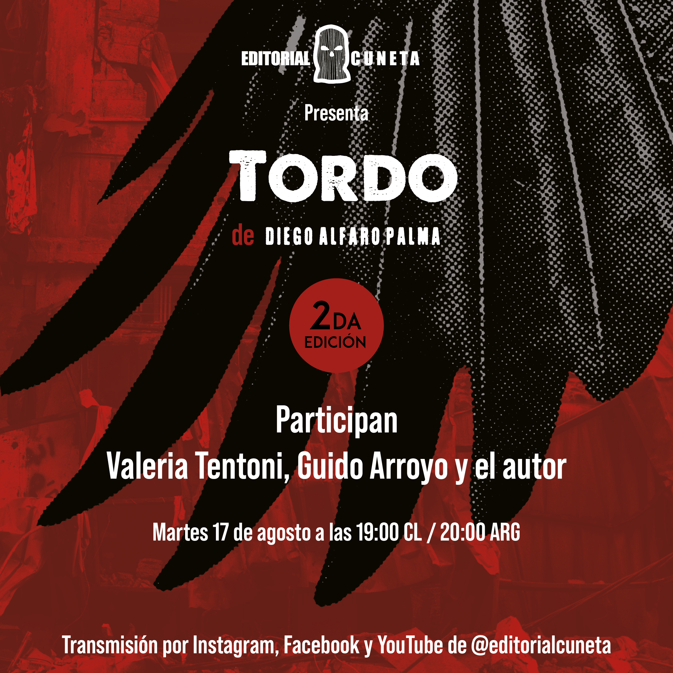 Súmense y no se resten: el Martes 17 de Agosto a las 19:00 me acompañarán dos grandes amigos en el lanzamiento de la segunda edición de «Tordo» por las rrss de @editorialcuneta: Valeria Tentoni y Guido Arroyo, a quienes admiro inmensamente y a quienes solicité que esta instancia fuera una gran excusa para tomarnos un trago a la distancia, reírnos y hablar de este libro que nos une. Nada de latas ni papers!