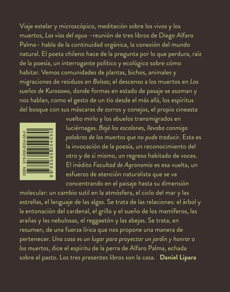 Viaje estelar y microscópico, meditación sobre los vivos y los muertos, Las vías del agua–reunión de tres libros de Diego Alfaro Palma– habla de la continuidad orgánica, la conexión del mundo natural. El poeta chileno hace de la pregunta por lo que perdura, raíz de la poesía, un interrogante político y ecológico sobre cómo habitar. Vemos comunidades de plantas, bichos, animales y migraciones de residuos en Bolsas; el descenso a los muertos en Los sueños de los sueños Kurosawa, donde formas en estado de pasaje se asoman y nos hablan, como el gesto de un tío desde el más allá, los espíritus del bosque con sus máscaras de zorros y conejos, el propio cineasta vuelto mirlo y los abuelos transmigrados en luciérnagas. “Bajé los escalones, llevaba conmigo palabras de los muertos que no pude traducir”. Esta es la invocación de la poesía, un reconocimiento del otro y de sí mismo, un regreso habitado de voces. El inédito Facultad de Agronomía es esa vuelta, un esfuerzo de atención naturalista que se va concentrando en el paisaje hasta su dimensión molecular: un cambio sutil en la atmósfera, el ciclo del mar y las estrellas, el lenguaje de las algas. Se trata de las relaciones: el árbol y la entonación del cardenal, el grillo y el sueño de los mamíferos, las arañas y las nebulosas, el reggaetón y las abejas. Se trata, en resumen, de una fuerza lírica que nos propone una manera de pertenecer. “Una casa es un lugar para proyectar un jardín y honrar a los muertos”, dice el espíritu de la perra de Alfaro Palma, echada sobre el pasto. Los tres presentes libros son la casa. Daniel Lipara